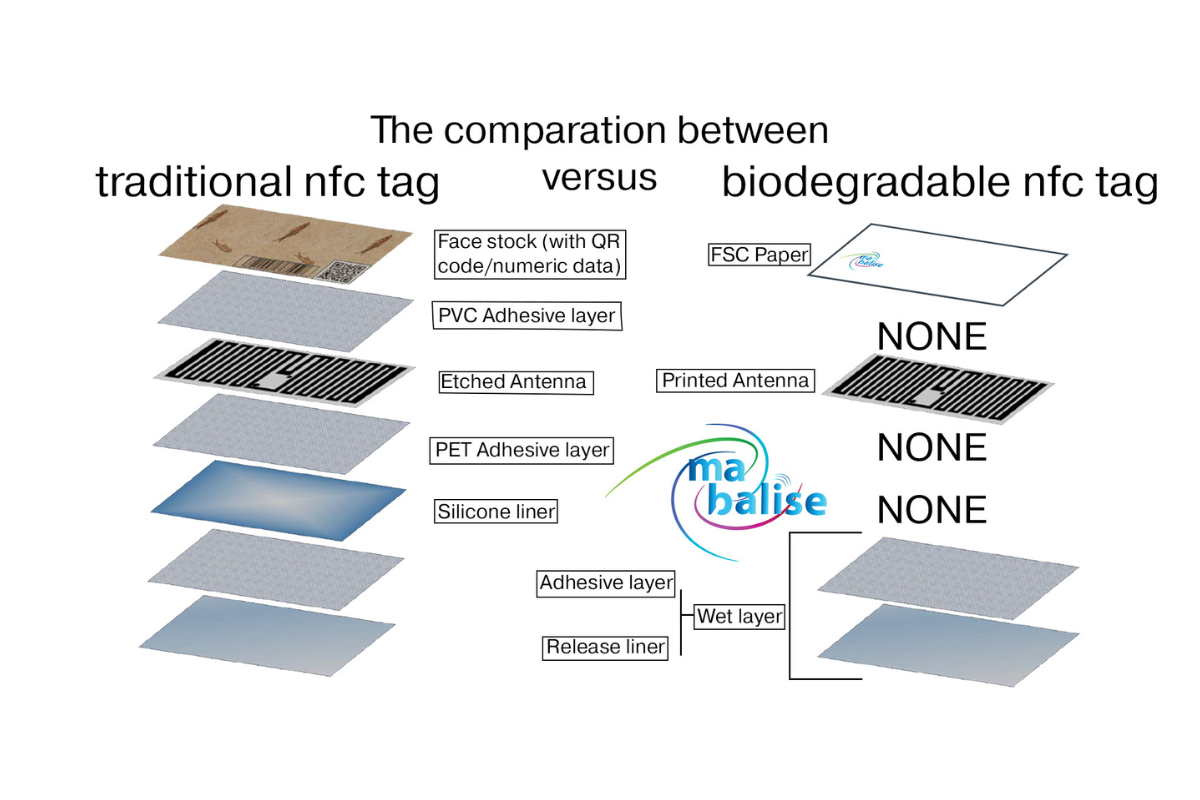 Forget the 7 layers of PVC/PET and chemical etching poisoning our planet for a century. We achieved the impossible: a 4-layer NFC/RFID tag, printed with conductive ink on FSC paper. This radical simplification delivers identical connected performance while eliminating 43% of layers and all plastic components. The technology gracefully disappears in 30 days in compost, leaving your paper and cardboard products traceable without a trace.