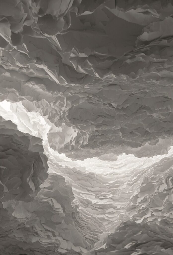 Apertura – Nel bianco la piega si distende. Le nuvole di carta occupano quasi tutto lo spazio, ma lasciano una fenditura: un varco, un respiro. La traccia non è ferita ma memoria del passaggio, come se il cielo fosse stato toccato e poi lasciato andare.