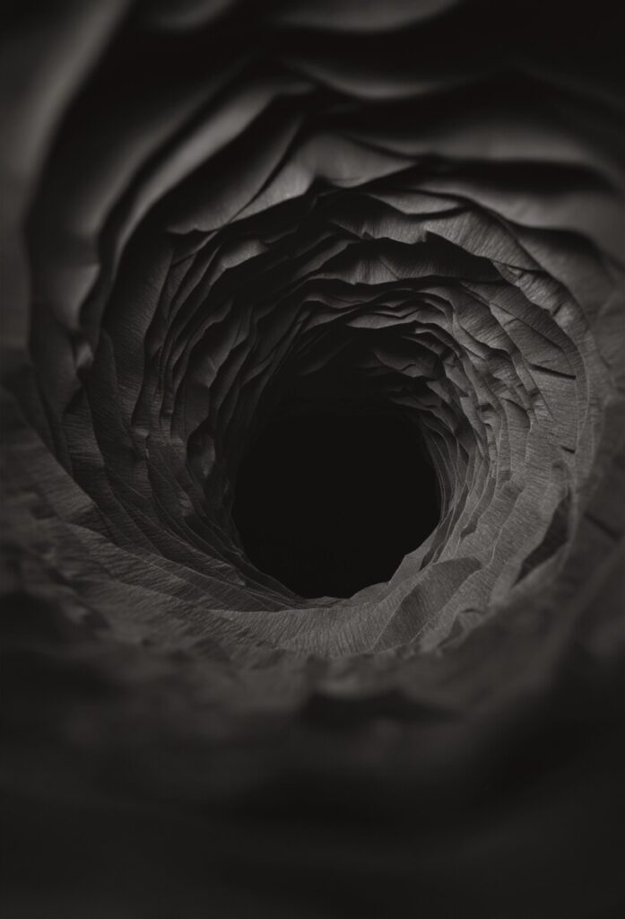 Collasso – Nel nero la piega non si apre né resiste: cede. Il buco nero di carta è un paradosso visivo: ciò che dovrebbe essere infinito e immateriale è fatto di materia sottile, segnata, vulnerabile. La traccia qui è assenza, attrazione silenziosa, fine del gesto.