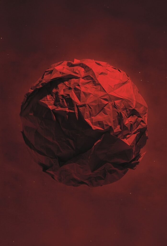 Compressione – Il rosso concentra energia. Le pieghe si stringono, si accumulano, costruendo un corpo celeste denso e instabile. La carta, fragile per natura, diventa metafora della forza che genera, del calore che precede l’esplosione o la nascita.