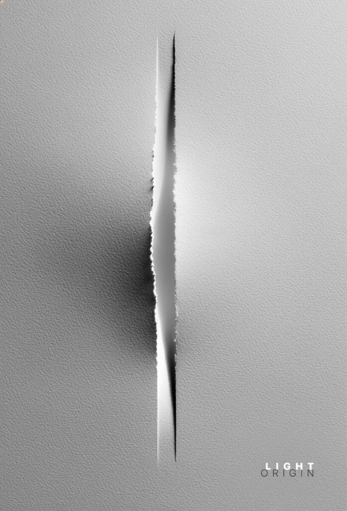 L’opera interpreta la carta come superficie originaria. Un foglio bianco viene attraversato da uno strappo sottile che interrompe la continuità della materia e rivela uno spazio nascosto. La luce emerge dalla frattura come un punto di nascita, suggerendo che ogni superficie custodisce un’origine invisibile al di sotto di essa.