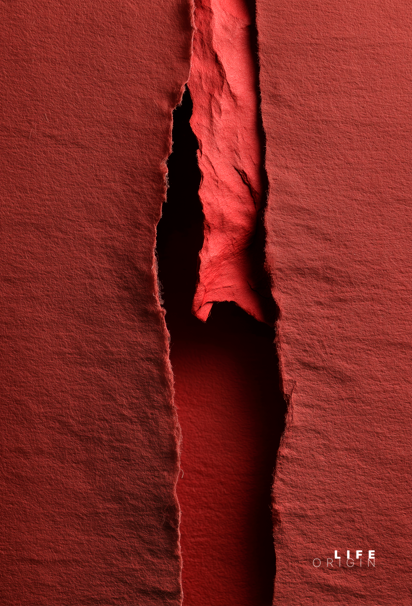 In una superficie rossa e materica, lo strappo si apre con maggiore intensità, rivelando un interno più profondo e vibrante. La lacerazione diventa gesto generativo, evocando energia, crescita e trasformazione. La carta smette di essere solo supporto e diventa corpo, luogo in cui la vita prende forma attraverso la rottura.