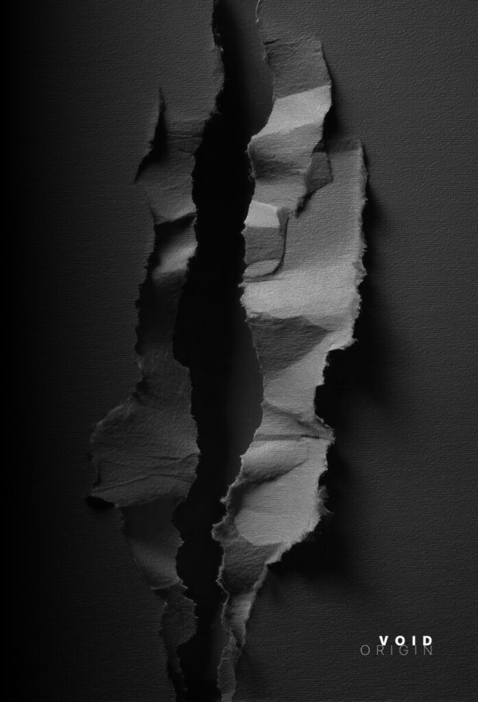 La superficie nera è attraversata da una frattura più ampia e irregolare, dove la carta si piega e si lacera mostrando un vuoto profondo. Qui l’origine non è più nascita ma dissoluzione: uno spazio silenzioso e assoluto che assorbe la materia. Il vuoto diventa così un’altra forma di origine, un luogo dove la superficie termina e qualcosa di invisibile prende il suo posto.