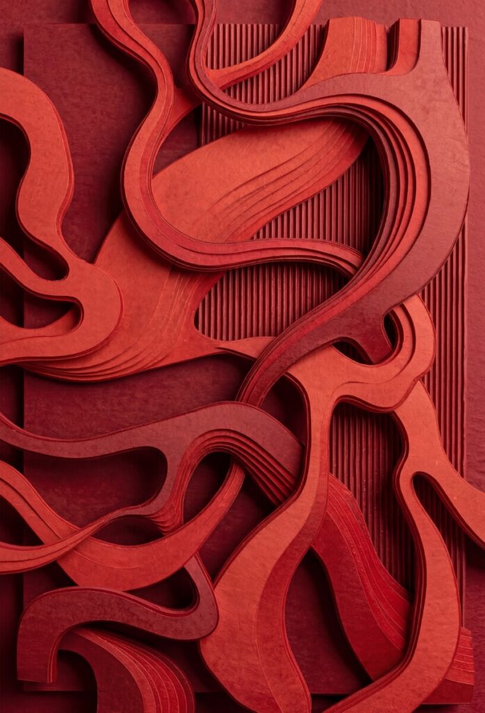 E’ un’immersione nella densità del rosso. Se il bianco era silenzio, qui la materia risponde alla forza, trasformandosi in un sistema complesso di pieghe. La composizione vive dello scontro tra due principi: un modulo verticale impone disciplina e misura, fungendo da sfondo per un dramma organico. Le creste fluide “rompono” la griglia, agendo come un improvviso crescendo. Le ombre profonde nelle rientranze sembrano pause fisicamente tangibili, mentre la luce sulle creste funge da finale risonante di ogni movimento, completando il viaggio iniziato nel bianco.