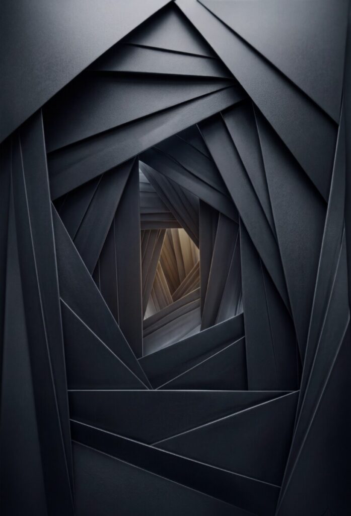 Conclude l’esplorazione degli ambienti densi. La natura organica di “White Flow” e l’espressione di “Pulsation” lasciano spazio a un’architettura rigida. Il nero qui non è un pigmento, ma la totale assorbimento della luce. Invece delle pieghe, ci sono spostamenti tettonici e spigoli netti. Una volontà geometrica attira i piani verso un unico centro, creando un vortice nell’abisso. La luce diventa un bisturi che ne traccia i bordi, mentre le ombre profonde si trasformano in zone di gravità. Questo è il punto di cristallizzazione della materia, dove il ritmo del trittico raggiunge il suo limite assoluto.